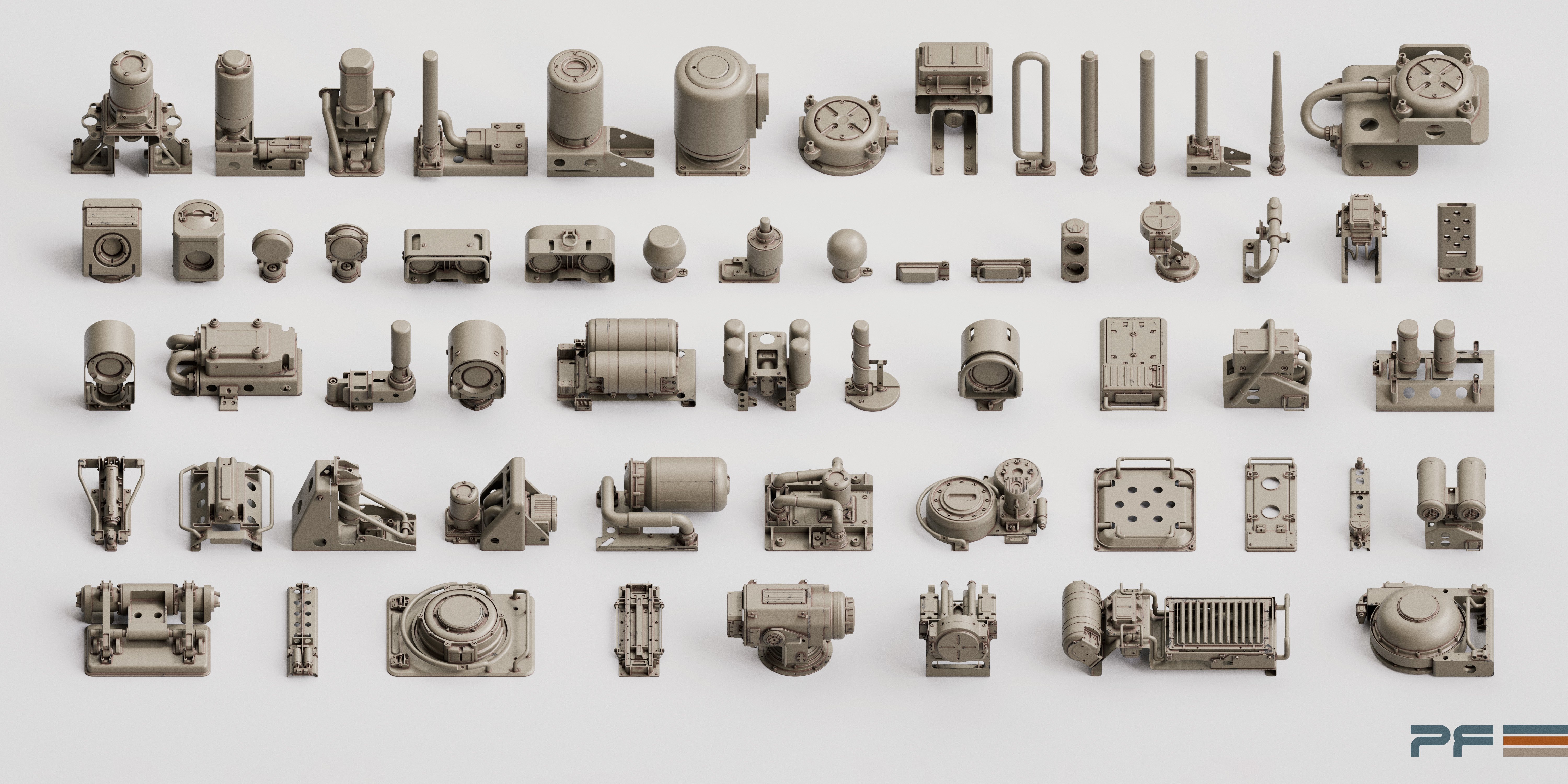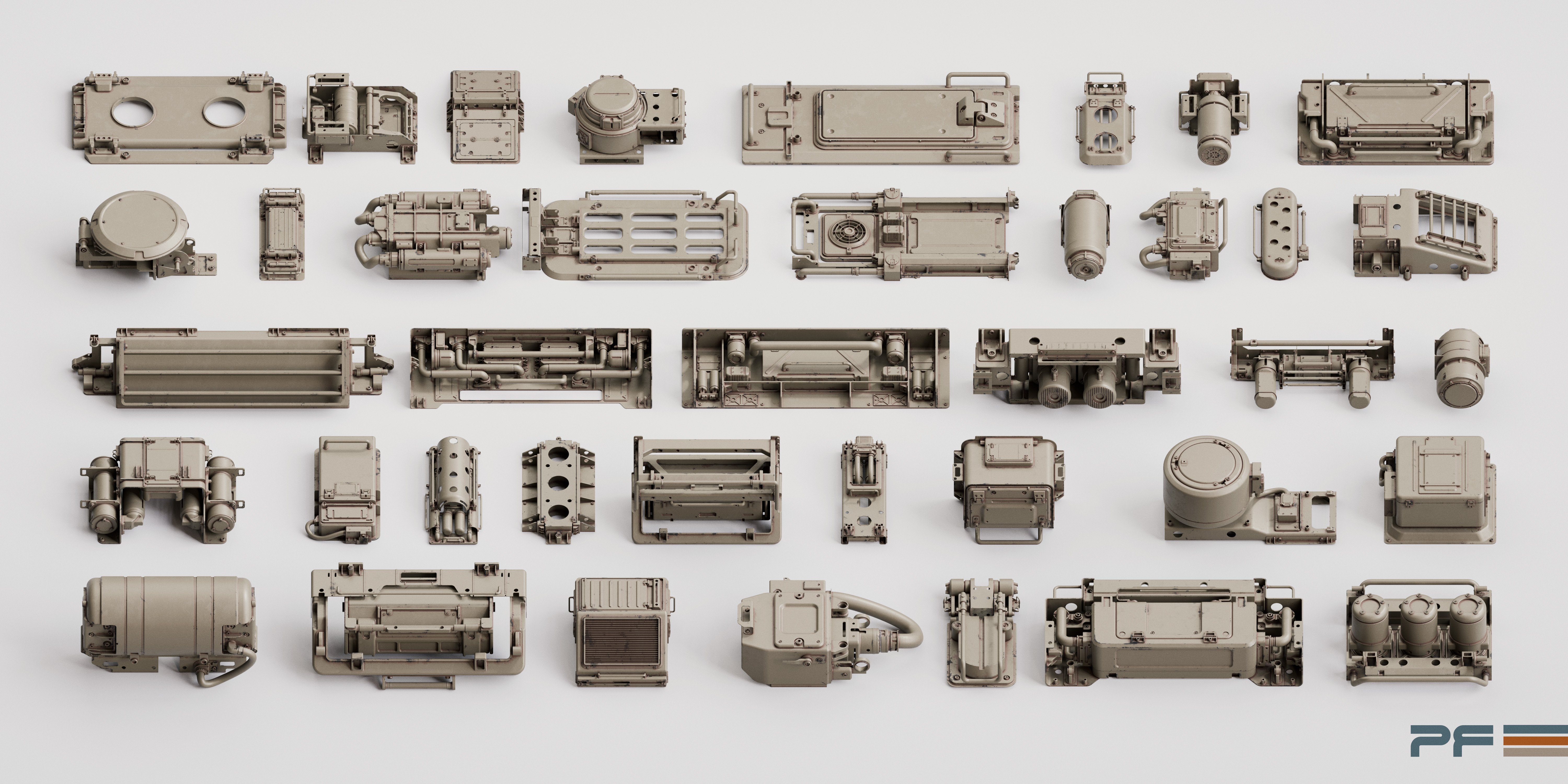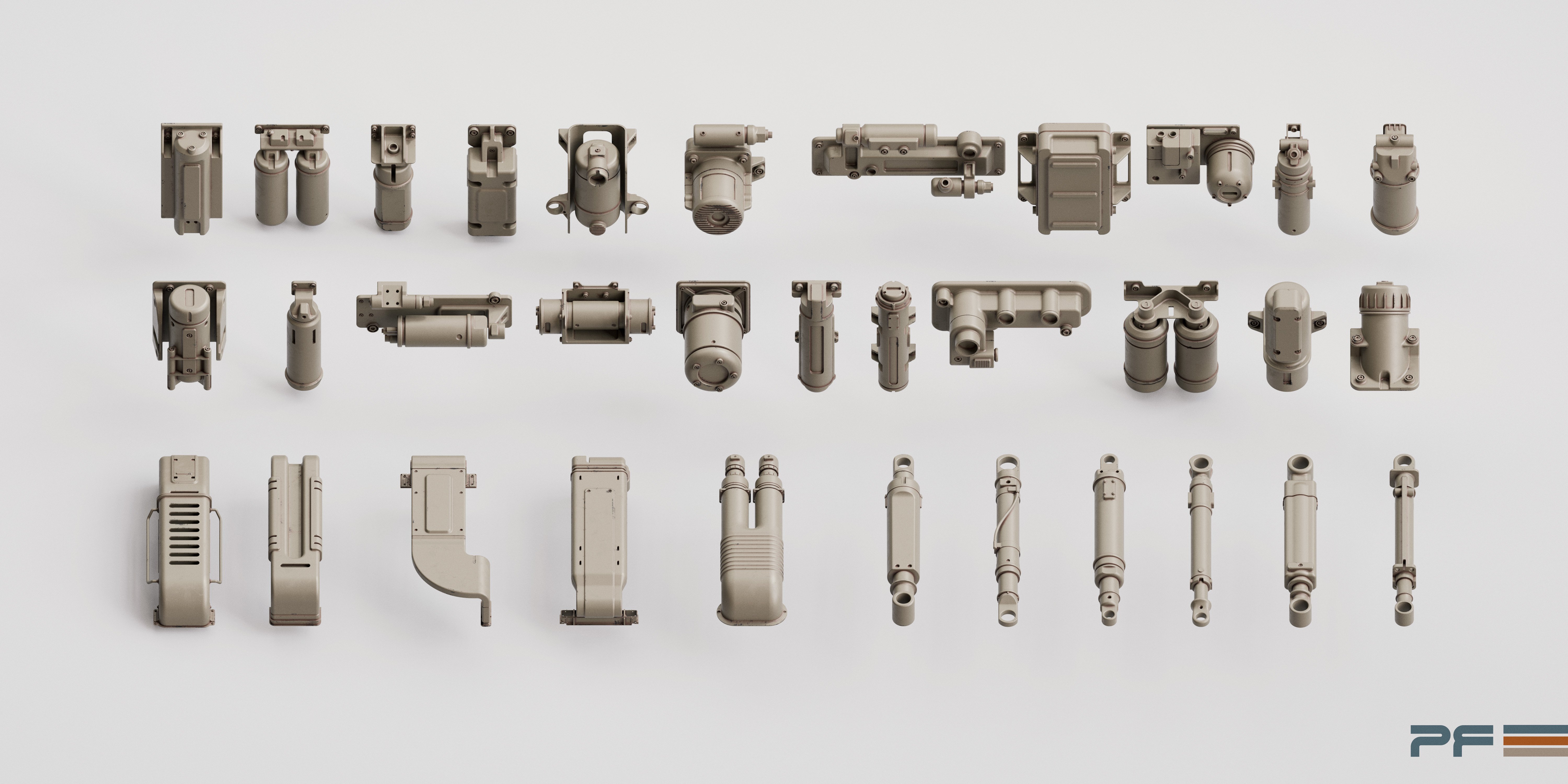 A comprehensive collection of various hard surface parts to help you detail your work.